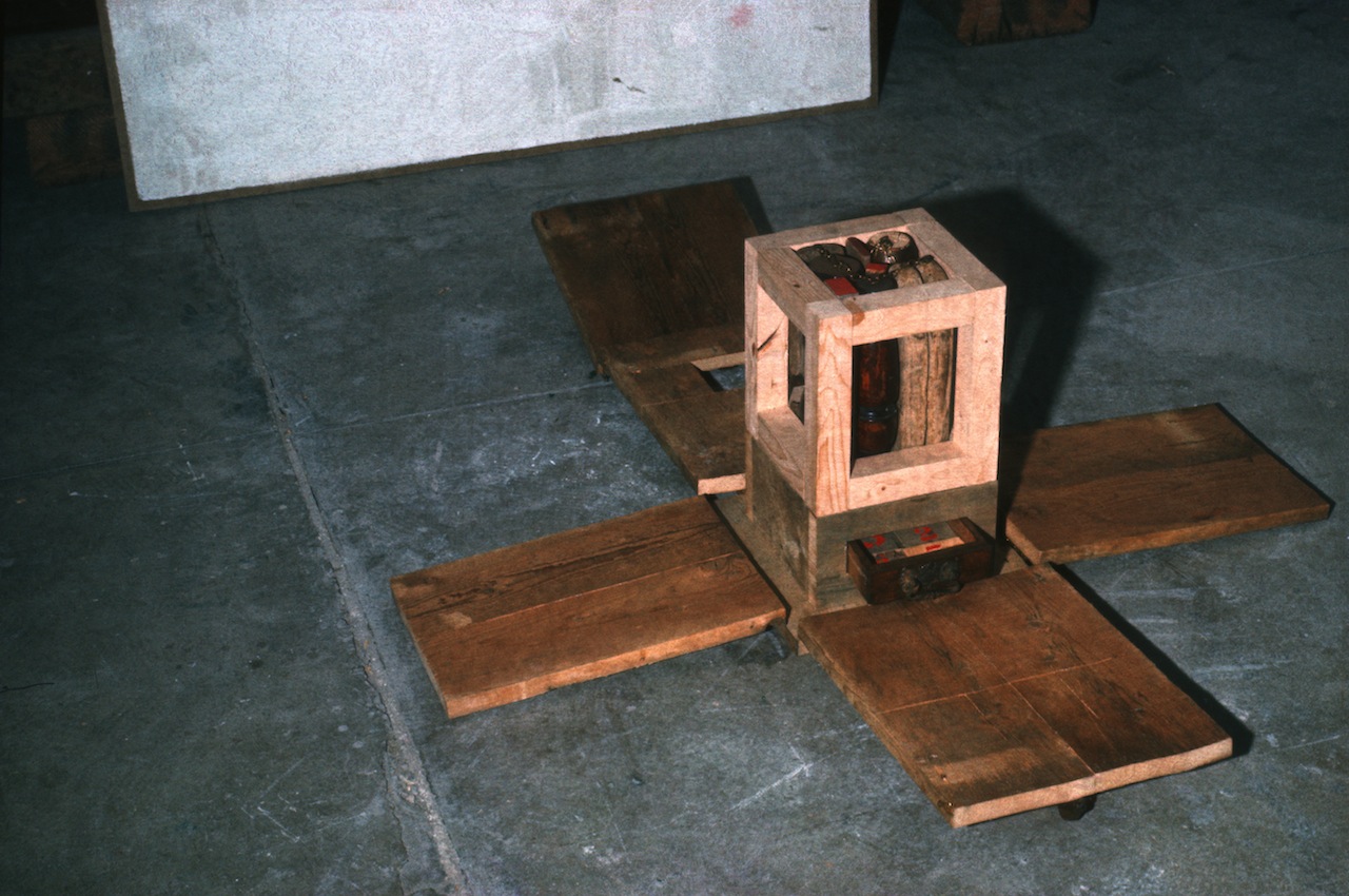 Unfolding BoxFebruary 1975 44 x 31 x 33 cm (closed) A casing made from floorboards and brass fittings unfolds to reveal a core of driftwood, furniture pieces and an old drawer containing stencilled scraps of wood.